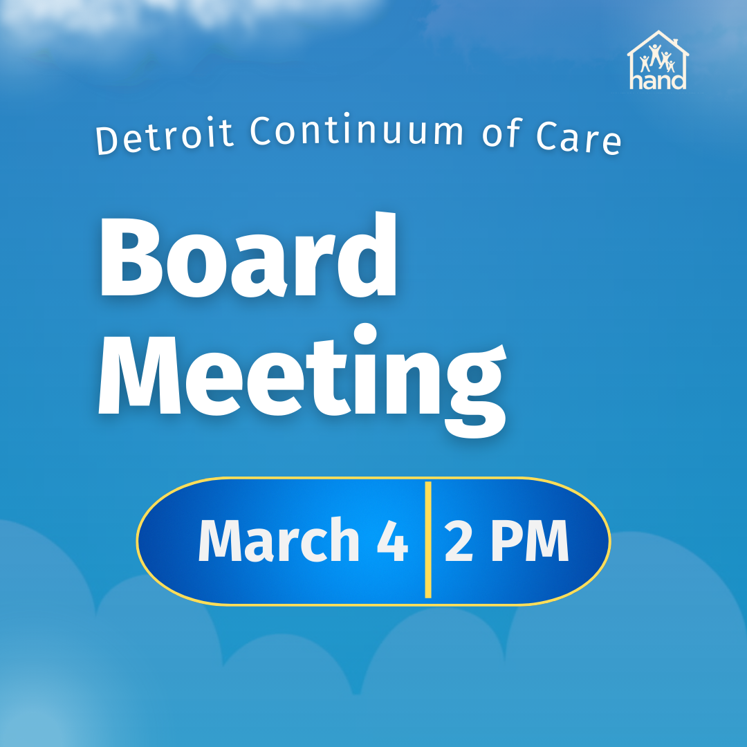 Detroit CoC Board Meeting Monday, March 4, 2024 2:00 PM 4:00 PM 14:00 16:00 Homeless Action Network of Detroit 3701 Miracles Blvd. Suite 101 Detroit, MI 48201 (map) Google Calendar ICS March 4th, Join us for our next Detroit CoC Board meeting!Register here